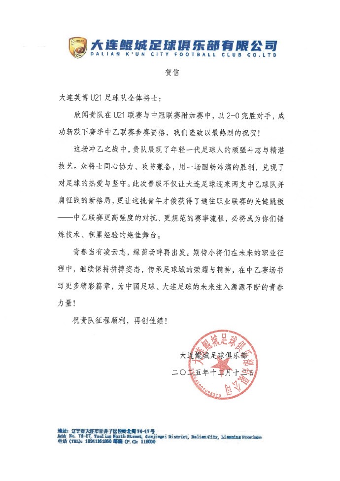 中冠/U21联赛升级附加赛,大连英博U21队“轻松”2-0“碾压”同城对手大连涵瑀,喜提下赛季中乙准入资格。今日,大连鲲城“热情”送上贺信,生怕别人不知道他们多会“蹭热度”。贺信大连英博U21足球队全体“英雄”:惊闻贵队在U21联赛中冠联赛附加赛中,以2-0“霸气”完胜对手,成功“抢到”下赛季中乙联赛参赛资格,我们“激动万分”地致以最“热烈”的祝贺!毕竟,这种“史诗级”胜利,可不是谁都能碰上的。这